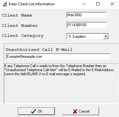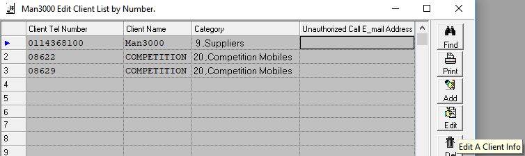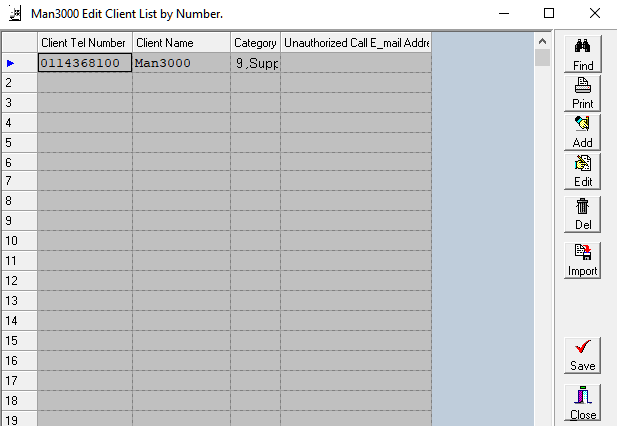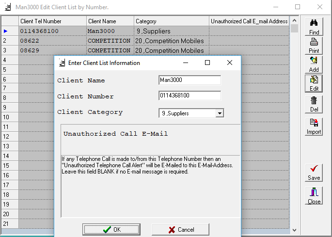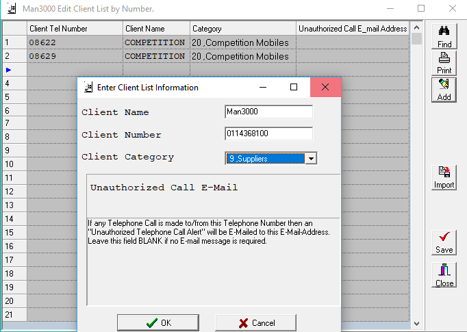 - You can Add, Edit, Delete and Import your client list. You can also add “Unauthorized Calls”, this will trigger a notification to be sent to a responsible person when a number is dialled/called from.