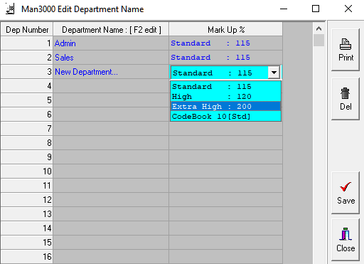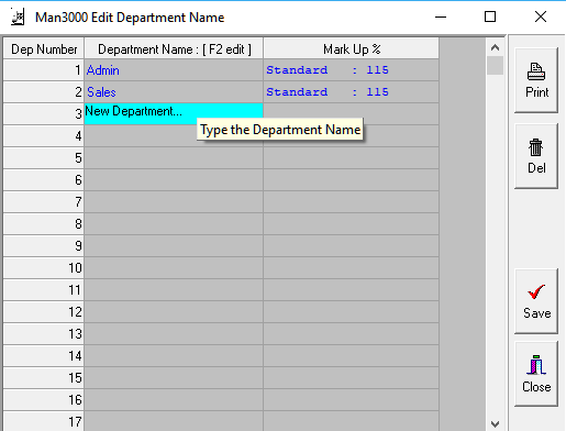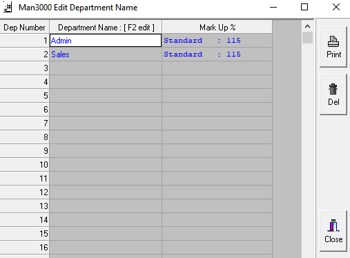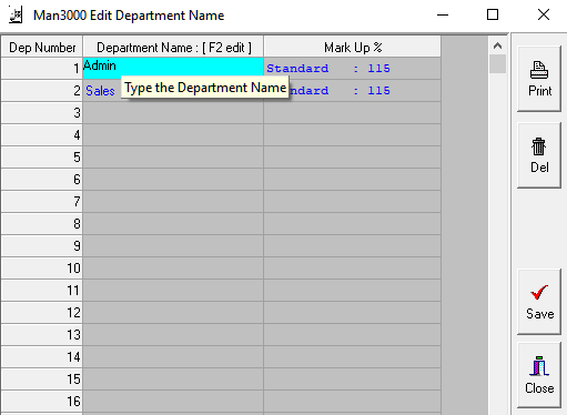1. To Add, you will need to simply double click in the “Department Name” field next to a “Dep Number” that does not currently have a name, once you have added a name please click “Save” which is located above the “Close” button